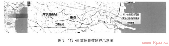 界面左邊設(shè)置了全景圖,剩余部分為濱海新區(qū)詳細(xì)地圖,圖上標(biāo)有管道走向,通過移動導(dǎo)航條(圖中紅色區(qū)域)來選擇顯示濱海新區(qū)的詳細(xì)地圖。