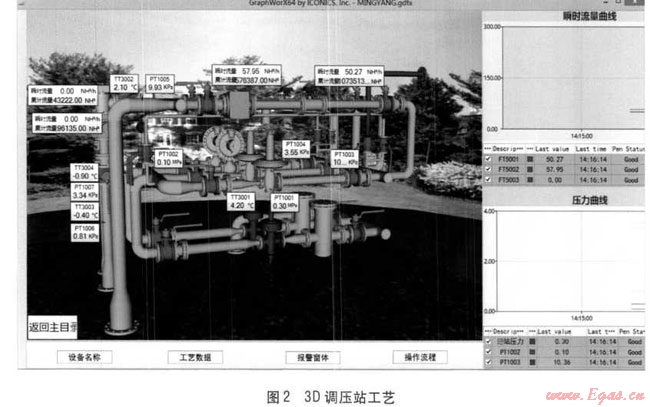 對于站點屬性,主要包括站區(qū)工藝、與干管的對接信息、工藝運行狀態(tài)、運行數(shù)據(jù)等。本系統(tǒng)通過平面流程和3D工藝模型相結(jié)合的方式提供站點全方位監(jiān)測,提供站點的數(shù)據(jù)日清單報表、月清單報表及年度清單報表,提供區(qū)域所有站點用氣量的時、日、月、年曲線,提供站點用氣量的歷史曲線。