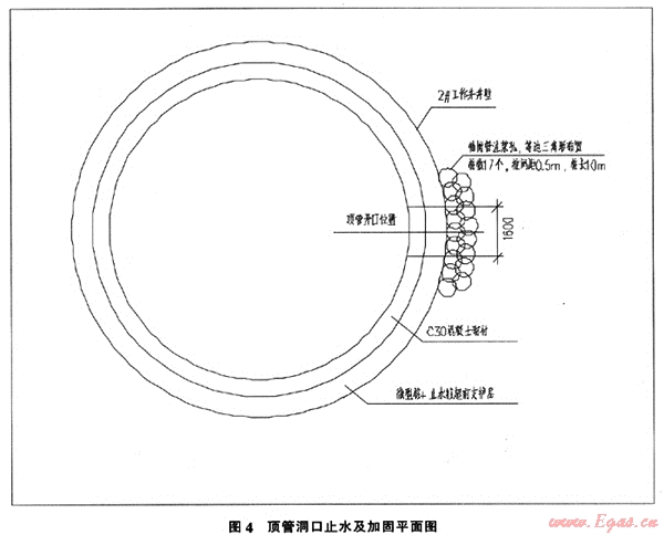工作難點:由于頂管洞口開口部位位于細(xì)砂層中,若直接在井壁開口將會有大量泥沙涌人作業(yè)井,引發(fā)地面塌陷。解決辦法:開口前。在支護(hù)結(jié)構(gòu)外圍施工兩排注漿孔,共17孔,采用袖閥管注漿法加固洞口外圍砂層,止水防滲。加固結(jié)構(gòu)見圖4。開口后洞口采用砌磚封門。