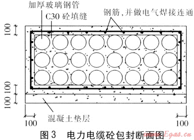 我們將電纜溝與輸氣管道交叉點兩側(cè)各10m以內(nèi)部分改為埋管(電纜在套管內(nèi)穿過)敷設(shè),套管采用加厚玻璃鋼管并用鋼筋混凝土包封(現(xiàn)澆施工),并對鋼筋網(wǎng)作電氣焊接連通,見圖3。通信管道原設(shè)計就采用埋管形式,故只在交叉位置前后各10m采用與電力電纜相同的鋼筋混凝土包封,并對鋼筋網(wǎng)作電氣焊接連通。