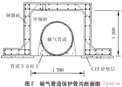 A號路為城市快速路,建設(shè)標(biāo)準(zhǔn)高,路面結(jié)構(gòu)厚度約80cm,路基需要分層碾壓以滿足道路密實度要求。考慮到輸氣管道設(shè)計壓力高,環(huán)向應(yīng)力大,為保證管道在道路施工及今后運行中的安全,我們對A號路車行道下的輸氣管道采用管溝保護(見圖2,圖中尺寸單位為mm,以下同)。管溝內(nèi)壁與輸氣管道之間凈距不小于50cm,采用現(xiàn)澆施工,兩端伸出道路邊緣2m,并要求施工中盡量保留輸氣管道周圍的原土,避免破壞管道防腐層。