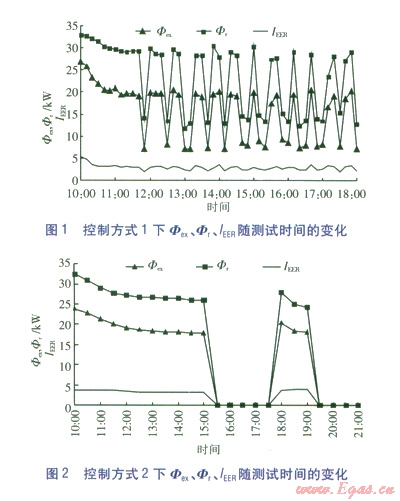 由圖l、2可知,對(duì)于控制方式1、2,在開始階段,Фex、Фr均比較接近,說明這兩種控制方式下土壤的初始條件大致相同。由于兩種控制方式下,地埋管換熱器、地板輻射供暖系統(tǒng)的流量基本保持不變,因此測(cè)試階段Pex,p、Pr,p也基本保持不變。由實(shí)測(cè)數(shù)據(jù)可計(jì)算得到,Pex,p、Pr,p的平均值分別為l.88、1.47 kW,單臺(tái)壓縮機(jī)運(yùn)行時(shí)Php的平均值為3 kW,兩臺(tái)壓縮機(jī)運(yùn)行時(shí)Php的平均值為5.5 kW。由此可知,在兩種控制方式下,Pex,p、Pr,p占聯(lián)合供暖系統(tǒng)耗電功率的比例都比較高。