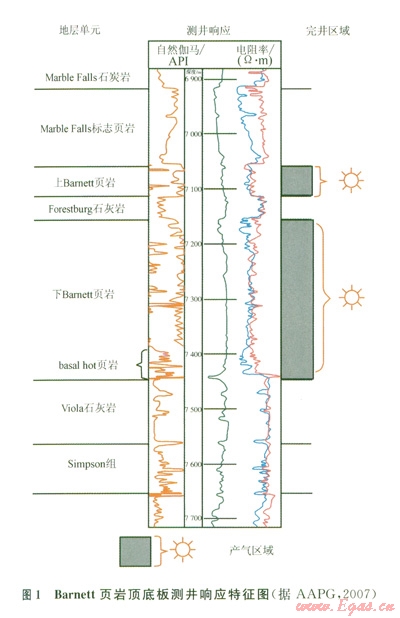 基于技術和成本方面的考慮,國外對頂、底板的研究歷來比較重視[4-5]。北美一些主要的頁巖氣盆地大都具有“三明治”式的展布特征。以美國福特沃斯盆地著名的Barnett頁巖為例,上Barnett頁巖以Marble Falls石灰?guī)r為頂板,Forestburg石灰?guī)r作為底板,圖1顯示,頂?shù)装逄帨y井響應特征為低自然伽馬值、高電阻率;而上Barnett頁巖段則顯示為高伽馬值、低電阻率的特征,可以明顯區(qū)分。下Barnett頁巖則是以Forestburg石灰?guī)r和Viola石灰?guī)r分別作為頂、底板,相應的頁巖氣藏也位于頂、底板之間的含氣泥頁巖層段內(nèi),封閉性較好。頂、底板封閉的含氣泥頁巖段為主力產(chǎn)氣層[6]。