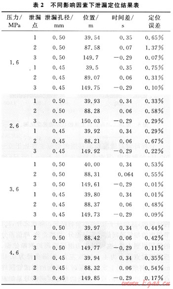 泄漏定位試驗(yàn)是與泄漏檢測試驗(yàn)一起進(jìn)行的,運(yùn)用泄漏檢測采集到的數(shù)據(jù),分析在不同泄漏工況下音波法泄漏定位的適用性及定位誤差。不同影響因素下泄漏定位結(jié)果如表2所示。