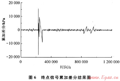 從上面對(duì)音波信號(hào)的時(shí)域和頻域分析中可以看出,信號(hào)的幅值和功率譜密度是可以作為泄漏判斷的特征量的,這驗(yàn)證了1.1節(jié)的分析結(jié)果。除此之外,1.1節(jié)提出的相鄰區(qū)間信號(hào)累加差分、均值差分、峰值差分的特征識(shí)別方法,也可以作為泄漏檢測的判斷依據(jù)。當(dāng)管道起點(diǎn)壓力為4.6MPa左右,泄漏孔徑為0.45mm時(shí),將泄漏點(diǎn)1發(fā)生泄漏時(shí)采集到的測試管段終點(diǎn)的聲壓進(jìn)行去噪,根據(jù)提出的相鄰區(qū)間信號(hào)累加差分、均值差分、峰值差分的算法,可分別得到終點(diǎn)信號(hào)累加差分結(jié)果如圖6所示,終點(diǎn)信號(hào)均值差分結(jié)果如圖7所示,終點(diǎn)信號(hào)峰值差分結(jié)果如圖8所示。