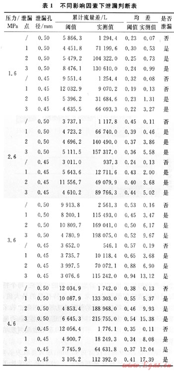 選取信號(hào)的累加差分和均值差分作為不同工況下泄漏判斷的特征量,以檢驗(yàn)泄漏檢測的可靠性,每個(gè)特征量的閾值選用泄漏前正常工況下特征量的最大值,以終點(diǎn)音波傳感器接收到的信號(hào)作為檢測對(duì)象。若采集信號(hào)的實(shí)際值大于閾值,則認(rèn)定管道發(fā)生泄漏,否則認(rèn)定管道處于正常狀態(tài)。不同影響因素下泄漏判斷結(jié)果如表1所示。