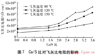 由圖7可知,飛灰比電阻隨Ca/S比的增大而增加。這是因?yàn)榧尤胧沂摿騽┖?,由于飛灰中的Ca0等堿性物質(zhì)大幅增加,同時(shí)S03小幅增加(見表5),使得飛灰比電阻大大增加。