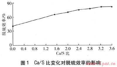 ① 鍋爐爐內(nèi)脫硫效率隨著Ca/S比的增大而提高。在Ca/S比較小時(shí),脫硫效率隨著Ca/S比的增大而迅速提高;當(dāng)Ca/S比達(dá)到一定值以后,脫硫效率提高得很緩慢,并且趨于一穩(wěn)定值。