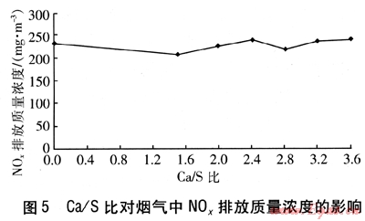 ⑤ 石灰石脫硫?qū)煔庵蠳0x的排放質(zhì)量濃度影響不明顯。本試驗(yàn)中N0x的排放濃度維持在200~240mg/m3,有很小的上升趨勢(shì)。