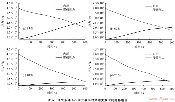 3) 池火作用下,LPG儲罐失效受到兩個因素控制,一是介質溫度升高導致的儲罐內介質壓力升高,二是氣相區(qū)壁溫升高導致的強度下降。兩條曲線的交叉點即為儲罐的失效點。儲罐內介質的充裝率越高,儲罐失效時間越短。