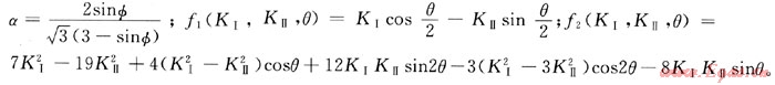 國內(nèi)外學(xué)者對(duì)裂紋的失穩(wěn)擴(kuò)展研究取得了豐碩的成果,建立了相應(yīng)的斷裂準(zhǔn)則[6~7]通過適用性分析,筆者選用了基于巖石破壞準(zhǔn)則的巖石斷裂判據(jù)[6]。筆者利用D-P破壞準(zhǔn)則,并結(jié)合裂紋尖端的應(yīng)力場(chǎng)、應(yīng)力強(qiáng)度因子和斷裂韌度提出了該判據(jù),具體推導(dǎo)過程見本文參考文獻(xiàn)[6]。