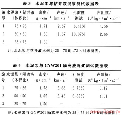 2) 在相同比例時,水泥漿與GYW201隔離液混漿的聲阻抗數(shù)據(jù)均大于水泥漿與鉆井液混漿,其抗壓強(qiáng)度也大于水泥漿與鉆井液混漿。無論常規(guī)密度水泥漿與鉆井液漿或GYW201隔離液以什么樣的體積比例混合,其混合后聲阻抗數(shù)據(jù)、強(qiáng)度數(shù)據(jù)均與水泥漿體積含量成正比,而初終凝時間與水泥漿體積含量成反比。