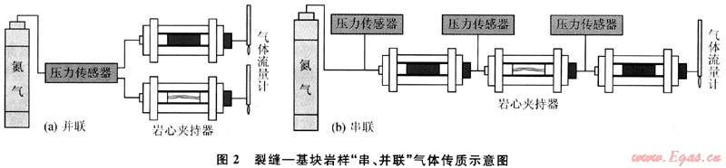 致密砂巖儲層中裂縫和基塊的滲流能力相差極大,致密砂巖天然氣在致密儲層中的傳質將受制于裂縫與基塊在空間上的配置關系,實驗設計了“串、并聯(lián)”兩類基塊-裂縫配置關系(圖2)。