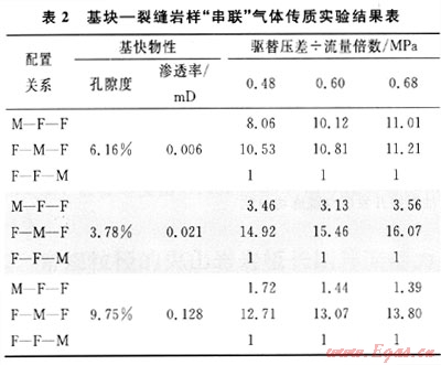 3) 裂縫巖樣“并聯(lián)”氣體傳質實驗表明,裂縫寬度是影響氣體傳質效率的關鍵參數(shù),天然裂縫傳質效率高于人工裂縫;裂縫-基塊巖樣“串聯(lián)”氣體傳質實驗揭示出,裂縫-基塊多尺度配置關系中,F(xiàn)-M-F配置關系最優(yōu),氣體傳質效率最高。