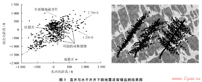 采用上述方法,通過井下微地震波測試,證實頁巖氣直井滑溜水大規(guī)模壓裂和水平井分簇射孔分段壓裂形成網(wǎng)絡(luò)裂縫,提高了壓裂改造效果(圖3)。