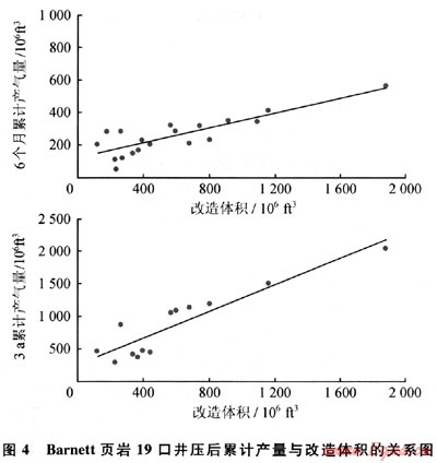 在Barnett頁巖19口有井下微地震監(jiān)測資料的井,改造后的體積與壓后6個月和3a累計產(chǎn)量的比較曲線見圖4。由圖4可見:19口井的壓裂改造體積在5.3×106~52.7×106m3,且壓后4個月的累計產(chǎn)量隨著改造體積的增加而增加,壓后3a增加的幅度更大,這充分說明改造體積對頁巖氣壓后產(chǎn)量的重要作用。