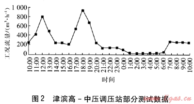 例如,津濱高-中壓調(diào)壓站有4臺型號為LWQ-A-2500的渦輪流量計,工況流量量程為125~2500m3/h,精度等級為1級,運行2臺。工況流量是指在管道介質(zhì)運行壓力及溫度條件下的流量。從2009年8月4日10:00至8月5日10:00津濱高-中壓調(diào)壓站測試統(tǒng)計數(shù)據(jù)看,其計量表內(nèi)天然氣溫度為22.4~22.9℃,壓力為0.56~0.80MPa。18:00為用氣高峰,瞬時流量為948m3/h;而凌晨1:00—6:00為用氣低谷,瞬時流量為30m3/h左右。部分測試數(shù)據(jù)見圖2。