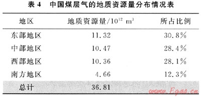 中國煤層氣的地質(zhì)資源量分布情況如表4所示。其中,埋深2000m以內(nèi)的煤層氣資源量為36.8×1012m3;埋深1500m以內(nèi)的可采資源量為10.9×1012m3。