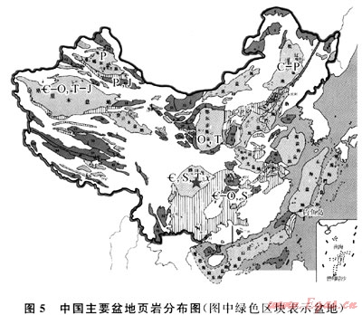頁巖氣資源廣泛分布于海相(主要)、陸相沉積盆地內(nèi),在全國范圍內(nèi),各地質(zhì)歷史時期都存在頁巖氣資源。中國主要盆地頁巖分布如圖5所示。