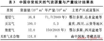 中國非常規(guī)天然氣資源量與產(chǎn)量統(tǒng)計結(jié)果如表3所示。
