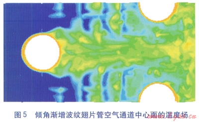 空氣進口速度為4m/s時,兩種波紋翅片管空氣通道中心面的溫度場分別見圖4、5。由圖4、5可知,兩種波紋翅片管的溫度分布都很紊亂且成狹長帶狀。在迎風側(cè),傾角漸增波紋翅片管空氣通道中心面空氣溫度上升得較快,且出口溫度高于均勻傾角波紋翅片管。這是由于傾角漸增波紋翅片結(jié)構加強了氣流擾動,從而強化了換熱。兩種波紋翅片管的共同點是:在迎風側(cè),溫度場分布稠密,溫度上升較快,換熱較強烈;在背風側(cè),溫度場分布稀疏,溫度變化較小,換熱較平緩。