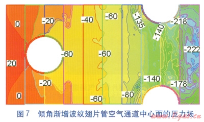 空氣進口速度為4m/s時,兩種波紋翅片管空氣通道中心面的壓力(表壓)場分別見圖6、7,圖中數(shù)值單位為Pa。由圖6、7可知,兩種波紋翅片管的壓力分布均比較紊亂。傾角漸增波紋翅片管空氣通道中心面的壓力降要大于均勻傾角波紋翅片管,且隨著翅片傾角的增大,等壓線分布更加稠密。原因是傾角漸增波紋翅片結(jié)構對流體的阻滯和擾動作用都較大,阻力比均勻傾角波紋翅片管大。