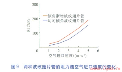 ②增大空氣進口速度可以提高波紋翅片管的換熱量,但阻力也隨之增大,應根據(jù)允許的空氣壓力降選擇合適的空氣進口速度。