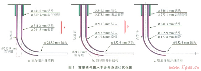 蘇里格氣田水平井鉆井經(jīng)歷斜導(dǎo)眼、直導(dǎo)眼和取消導(dǎo)眼3個(gè)階段,針對試驗(yàn)期Æ311.15mm機(jī)械鉆速低、大井眼螺桿造斜率低、斜井段施工周期長、井壁穩(wěn)定性差等工程難點(diǎn),通過理論研究和現(xiàn)場試驗(yàn),確定了蘇里格氣田水平井的主體井身結(jié)構(gòu)為Æ215.9mm斜井段+Æ152.4mm水平井段(圖3),既能大幅縮短鉆井周期,又能滿足目前主體改造技術(shù)要求[10]。在剖面優(yōu)化上,將剖面類型從中短半徑轉(zhuǎn)變?yōu)殚L半徑,靶前距從350m增加到450m左右,復(fù)合鉆井段70%以上,通過“上急下緩”雙增剖面,以84°左右井斜穩(wěn)斜探氣頂,使軌跡控制始終占據(jù)主動,確保準(zhǔn)確入窗。同時(shí),通過巖石可鉆性和鉆遇地層巖石礦物組分研究,在鉆頭結(jié)構(gòu)、水力參數(shù)、復(fù)合片性能等方面進(jìn)行了個(gè)性化設(shè)計(jì),改進(jìn)流道設(shè)計(jì)和外部結(jié)構(gòu),優(yōu)選了適合于斜井段、水平段鉆井的PDC鉆頭,實(shí)現(xiàn)了PDC鉆頭全井段的應(yīng)用,提高了機(jī)械轉(zhuǎn)速,縮短了鉆井周期。