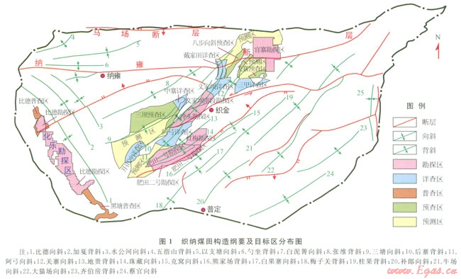 織納煤田位于貴州省中西部,主要包括比德向斜、三塘向斜、阿弓向斜、珠藏向斜、關(guān)寨向斜5個(gè)向斜單元,含煤面積約為l016.3km2,區(qū)內(nèi)煤田地質(zhì)工作程度高,除煤炭預(yù)測(cè)及預(yù)查區(qū)外,煤炭勘查面積達(dá)695.64km2,煤炭總資源量為90.33×108t;據(jù)貴州省煤田地質(zhì)局l996年提交的“貴州省煤層氣資源評(píng)價(jià)報(bào)告”[1],織納煤田煤層氣資源量為7611×108m3,但該區(qū)煤層氣的系統(tǒng)評(píng)價(jià)還很薄弱。因此,對(duì)煤出煤層氣資源狀況、賦存條件進(jìn)行全面分析和評(píng)價(jià),優(yōu)選煤層氣重點(diǎn)勘查和開(kāi)發(fā)區(qū)塊很有必要[2-4]。