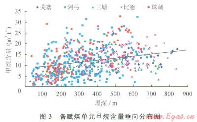 全區(qū)含氣量為0.48~32.69m3/t,平均為ll.90m3/t,各向斜以東部的關(guān)寨向斜最高,平均含量為15.47m3/t,比德向斜和珠藏向斜次之,平均含量分別為12.94、12.54m3/t,阿弓向斜最低,平均含量為10.15m3/t;氮?dú)夂坎桓?,一般小?span lang="EN-US">2m3/t;蕈烴平均含量0.75m3/t;全區(qū)甲烷含量以肥田二號(hào)最高,平均為l6.90m3/t。評(píng)價(jià)區(qū)總體顯示甲烷含量隨埋深的增加而增加,趨勢(shì)較為明顯,表明埋深對(duì)煤層氣含氣性具有重要的控制作用(圖3)。