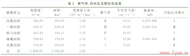 5個(gè)賦煤?jiǎn)卧?,關(guān)寨向斜的煤層氣資源量和資源量豐度最大、最高,分別為239.60×108m3/km2和2.34×108m3/km2,為優(yōu)選聚氣帶;其次比德向斜,資源量豐度較高(1.98×108m3/km2)。