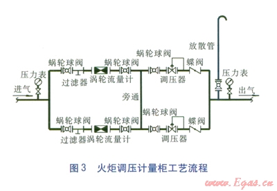 調(diào)壓計量柜內(nèi)安裝兩路調(diào)壓計量裝置,在兩路并聯(lián)的前提下增加旁通管將兩路裝置連接。火炬調(diào)壓計量柜工藝流程見圖3。燃?xì)庥嬃吭O(shè)施安裝于調(diào)壓器之前,一路采用工況(298.15K,0.26MPa)流量為l000m3/h的渦輪流量計;另一路計量采用工況(298.15K,0.26MPa)流量為650m3/h渦輪流量計:調(diào)壓器最大流量>4500m3/h。