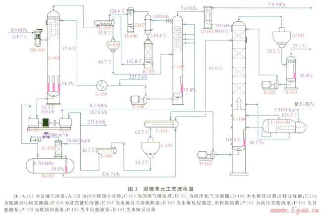 普光凈化廠引進(jìn)美國(guó)Black&Veatch公司專利技術(shù),以MDEA溶液作為吸收劑,采用兩級(jí)吸收、級(jí)間冷卻工藝選擇性吸收H2S,其工藝流程如圖l所示。經(jīng)過濾器(SR-l01)分離出的高含硫天然氣進(jìn)入一級(jí)吸收塔(C-101),與MDEA溶液在吸收塔內(nèi)逆流接觸,在二級(jí)吸收塔(C-102)底部用泵抽出半富胺液,經(jīng)過中間冷卻器(E-105),然后返回一級(jí)主吸收塔頂部,一級(jí)主吸收塔底部富胺液經(jīng)液力透平(H-101)回收能量后,進(jìn)入富胺液閃蒸罐(D-102),閃蒸后的胺液經(jīng)貧富胺液換熱器(E-101)換熱后進(jìn)入再生塔(C-l04)再生,再生后的貧胺液循環(huán)使用[2-4]。閃蒸出的氣體經(jīng)閃蒸塔吸收H2S后分兩路,少部分進(jìn)入尾氣焚燒爐伴燒,大部分放空至低壓火炬燒掉。