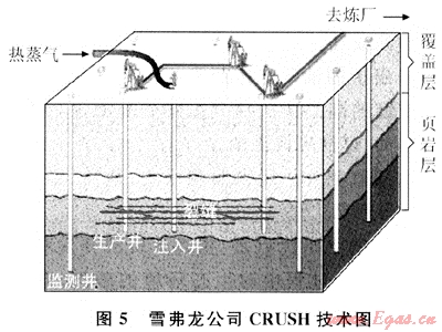 2006年,雪弗龍公司和Los Alamos國(guó)家實(shí)驗(yàn)室聯(lián)合開(kāi)發(fā)了CRUSH技術(shù),并將根據(jù)設(shè)計(jì)的含有2~5個(gè)四點(diǎn)井網(wǎng)單元的工業(yè)試驗(yàn)?zāi)P?,進(jìn)行實(shí)驗(yàn)室室內(nèi)實(shí)驗(yàn)和小規(guī)模的現(xiàn)場(chǎng)試驗(yàn)。目前主要研究注入高溫CO2加熱油頁(yè)巖層技術(shù)(圖5)。該技術(shù)首先對(duì)頁(yè)巖層進(jìn)行爆破壓裂,提高CO2與干酪根接觸的表面積,將CO2以對(duì)流的方式從豎直井導(dǎo)入,通過(guò)一系列水平裂縫加熱頁(yè)巖層。生成的烴氣經(jīng)垂直井采出。該技術(shù)是基于1950年代Sinclair油氣公司利用垂直井間自然和引導(dǎo)的裂縫開(kāi)采地下干酪根的試驗(yàn)開(kāi)發(fā)的[12]??捣剖凸竞桶⒖藗惔髮W(xué)的研究表明:CO2是一種能使頁(yè)巖油很好回收的載體,并申請(qǐng)了專利[12]。該技術(shù)需要大量水,并進(jìn)行現(xiàn)場(chǎng)生產(chǎn),對(duì)環(huán)境破壞較大[13]。