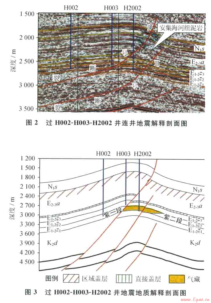結(jié)合生產(chǎn)動態(tài)資料,斷層兩側(cè)目的層紫二段均有砂體發(fā)育,斷層下盤H2002井在紫二段產(chǎn)氣,在斷層上盤的構(gòu)造高點(diǎn),新完鉆的評價(jià)井H003井海拔明顯高于H2002井,但在紫二段卻未見油氣顯示,試氣結(jié)果為干層,進(jìn)一步證明了l號斷裂具有較好的側(cè)向密封性。