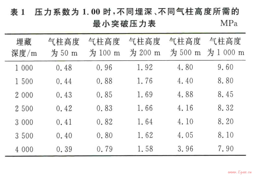 衡量蓋層封閉能力大小的直接標(biāo)志就是在一定地質(zhì)條件下封閉烴柱的高低,其可由突破壓力的大小獲得,同時(shí)與氣藏的壓力系數(shù)、埋藏深度也有關(guān)系。該區(qū)壓力系數(shù)為0.96,屬于正常壓力系統(tǒng),因此對應(yīng)的壓力系數(shù)選擇1.00;紫二段埋藏深度介于3500~3650m。根據(jù)不同埋深不同氣柱高度所需的最小突破壓力經(jīng)驗(yàn)值(表1),3500m埋深封閉200m氣柱高度需要的突破壓力不到2.0mPa,而該區(qū)實(shí)驗(yàn)分析所得上覆泥巖的突破壓力介于2.0~3.0mPa,故可封閉的氣柱高度大于200m,而儲層圈閉的幅度僅為180m,小于可封閉的氣柱高度,因此該區(qū)的泥巖蓋層對儲層是非常有效的,即當(dāng)圈閉完全注滿氣體時(shí),泥巖蓋層也可封閉紫二段儲層。