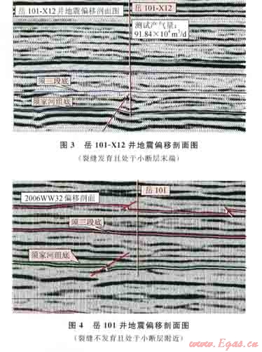 該區(qū)由于斷層規(guī)模較小,在二維地震解釋的須家河組底構(gòu)造圖中,部分小斷層未解釋?zhuān)谄破拭嬷锌勺R(shí)別出。處于裂縫的可能發(fā)育區(qū),加砂壓裂后,也能獲得高產(chǎn)。比如岳l01、岳111井,可能是與小斷層附近發(fā)育的裂縫有了溝通,氣井獲得了高產(chǎn)氣流(圖4)。