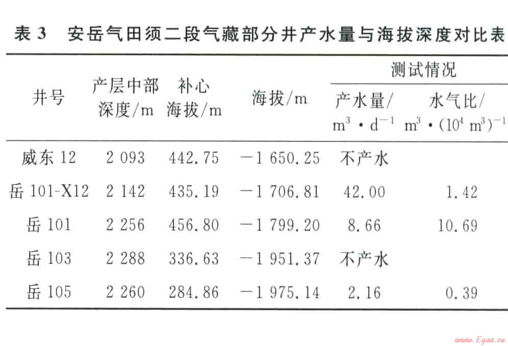 從生產(chǎn)井產(chǎn)水情況與海拔深度對(duì)比分析認(rèn)為(表3):海拔高的井如岳l01-Xl2井高產(chǎn)水,而海拔低的井如岳l03井不產(chǎn)水,目前生產(chǎn)井氣水關(guān)系與海拔深度沒(méi)有明顯關(guān)系,產(chǎn)水大小不受構(gòu)造控制。