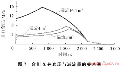 圖7為不同的溢流量與壓井套壓的關(guān)系曲線,可以看出,溢流量越大,壓井最高套壓越大。在實(shí)際壓井操作過程中,池體積上漲16.2m3,套壓由12MPa上升為16~16.9MPa,壓井最高套壓計(jì)算結(jié)果為15.8MPa,與計(jì)算結(jié)果相符。因此,該井采用1.23g/cm3的鉆井液最大允許溢流量不超過3.5m3(井口壓力不超過7.2MPa)。