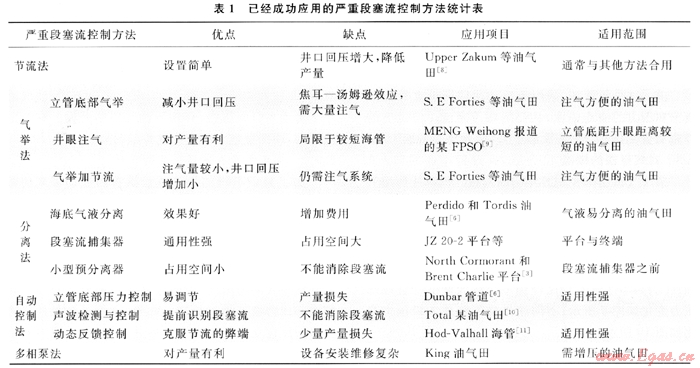 筆者將各種已成功應(yīng)用于油氣田生產(chǎn)的嚴(yán)重段塞流控制方法進(jìn)行了總結(jié),結(jié)果如表1所示。每種控制方法都有一定的適用范圍,隨著流體物性、海底路由、油氣田產(chǎn)量以及下游設(shè)施的不同而不同。應(yīng)針對(duì)不同的工程項(xiàng)目,開展具體模擬分析,必要時(shí)可以結(jié)合多種方法來控制嚴(yán)重段塞流。