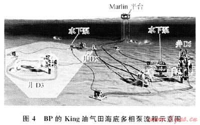 Henriot提出多相泵可用來消除嚴(yán)重段塞流[7]的方法。2007年英國石油公司(BP)在GOM的King油氣田水深1676m處安裝并啟用了2臺(tái)海底多相泵,其流程示意圖如圖4所示,在增壓和保證了油氣田產(chǎn)量的同時(shí),也削弱了嚴(yán)重段塞流。