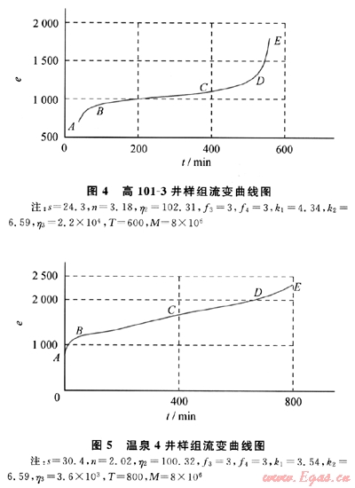 圖4中的AB段是油氣井在外界作用下的減速損傷階段,與承載的時(shí)間關(guān)系不大,為瞬間損傷。在第一保護(hù)區(qū)的作用下,損傷速度由大變小,損傷加速度小于0。BC段是油氣井等速損傷階段,此階段流變曲線形似一條直線,損傷速度接近常數(shù),損傷加速度為0。CD段是油氣井加速損傷階段,此階段損傷速度不斷增大,加速度也大于0。AD段是安全流變階段,其中D點(diǎn)是突變警戒點(diǎn),從此點(diǎn)開始油氣井的運(yùn)動開始發(fā)生了質(zhì)變,進(jìn)入了危險(xiǎn)狀態(tài)。DE屬于安全突變階段。