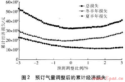 由圖2可知,在負(fù)調(diào)整比例區(qū)間,隨著燃?xì)忸A(yù)測調(diào)整幅度的增加,由于超提日數(shù)和超提氣量增加,超提損失的增長速度明顯大于欠提損失的降低速度,總損失快速增加;在正調(diào)整比例區(qū)間,隨著燃?xì)忸A(yù)測調(diào)整幅度的增加,由于欠提日數(shù)和欠提氣量增加,欠提損失的增長速度大于超提損失的降低速度,總損失逐步增加。冬半年經(jīng)濟(jì)損失與總經(jīng)濟(jì)損失變化趨勢基本相同,夏半年經(jīng)濟(jì)損失在調(diào)整比例為1.5%時最小。