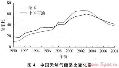 中國(guó)的天然氣儲(chǔ)采比在1990年僅為16,后來(lái)持續(xù)增長(zhǎng),1998年儲(chǔ)采比首次突破40(為42),2003年達(dá)到最高值(為61,見圖4),隨后因年產(chǎn)量增加而略有下降,2008年為42。中國(guó)石油的儲(chǔ)采比從1990年的10增至2003年的67,達(dá)到高峰,隨后下降至2008年的39。2008年中國(guó)石化的儲(chǔ)采比為75,中國(guó)海油為33。從目前的儲(chǔ)采比來(lái)看,中國(guó)天然氣產(chǎn)量快速增長(zhǎng)具有較好的儲(chǔ)量基礎(chǔ)。