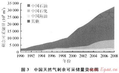 天然氣儲(chǔ)量進(jìn)入新的增長(zhǎng)高峰期。自2000年起,中國(guó)平均每年新增天然氣可采儲(chǔ)量3018億立方米,其中中國(guó)石油年均新增2238億立方米,占全國(guó)平均新增可采儲(chǔ)量的74%(圖2)。截至2008年底,中國(guó)累計(jì)探明天然氣可采儲(chǔ)量3.9萬(wàn)億立方米。白1999年起,中國(guó)的天然氣剩余可采儲(chǔ)量快速增長(zhǎng),從1萬(wàn)億立方米增至2008年的3.2萬(wàn)億立方米,增長(zhǎng)了2.2倍。截至2008年底,中國(guó)石油的剩余可采儲(chǔ)量占全國(guó)的74%(圖3)。天然氣儲(chǔ)量的高速增長(zhǎng)支撐了全國(guó)天然氣產(chǎn)量的快速提高。
