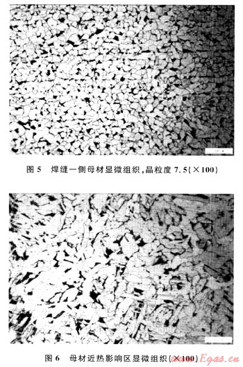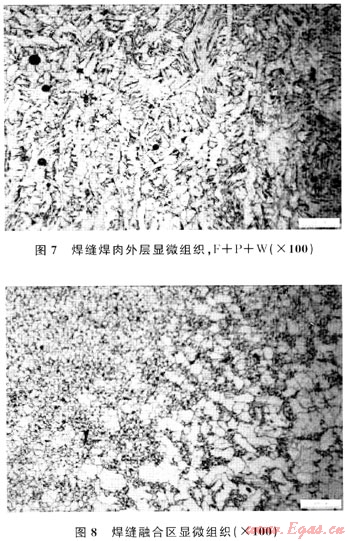 顯微組織及夾雜物分析結(jié)果表明:管線母材顯微組織為鐵素體+珠光體,有少量帶狀組織,且晶粒度為7.5級(圖5);熱影響區(qū)組織為鐵素體+珠光體,晶粒度分布極不均勻,范圍為5.5~9.5級(圖6);焊縫熔池組織為鐵素體+少量珠光體+少量魏氏組織,晶粒度為8.5級(圖7、8)。綜合評定該管線焊縫熔合情況為完全熔合。