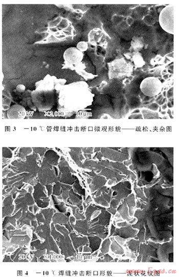 母材拉伸試樣宏觀斷口特征由纖維區(qū)、剪切唇及放射區(qū)3部分組成,屬于韌性斷裂,未發(fā)現(xiàn)明顯的原始缺陷(圖1);焊縫拉伸試樣其中兩件斷在母材,一件斷在焊縫處。從宏觀上看,都是韌性斷口,具有韌窩形貌特征,存在氣孔、未焊透等缺陷;母材室溫沖擊試樣斷口屬韌性斷口,在-10℃下沖擊試樣斷口纖維區(qū)較少,以脆斷為主;焊縫沖擊試樣宏觀上觀察斷口由晶狀區(qū)、纖維區(qū)及剪切唇3部分組成,大部分為晶狀區(qū),纖維區(qū)較少,以脆斷為主,屬于韌-脆性混合型斷口,存在氣孔、未焊透缺陷,如圖2所示;-10℃下沖擊試樣斷口纖維區(qū)較少,具有解理、準解理形貌以及泥狀花樣特征,以脆斷為主,存在氣孔、未焊透等缺陷(圖3、4)。