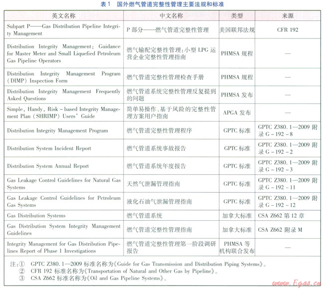 燃?xì)夤艿劳暾怨芾矸ㄒ?guī)和標(biāo)準(zhǔn)是實施管道完整性管理的重要指導(dǎo)性文件。為了有效推進燃?xì)夤艿劳暾怨芾砉ぷ鳎绹?、加拿大等國家燃?xì)夤芾砗脱芯繖C構(gòu)制定了相關(guān)的法規(guī)和標(biāo)準(zhǔn),主要的法規(guī)和標(biāo)準(zhǔn)見表l。表l中APGA是美國公共燃?xì)鈪f(xié)會的簡稱,GPTC是美國燃?xì)鈪f(xié)會(簡稱AGA)的下屬機構(gòu)燃?xì)夤艿兰夹g(shù)委員會的簡稱。