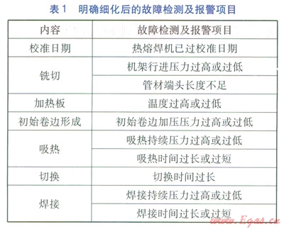 GB/T 20674.1—2006對(duì)自動(dòng)熱熔焊機(jī)故障檢測(cè)項(xiàng)目的要求較為概括,因此我們對(duì)自動(dòng)熱熔焊機(jī)的故障檢測(cè)及報(bào)警項(xiàng)目進(jìn)行明確細(xì)化(見表l)。