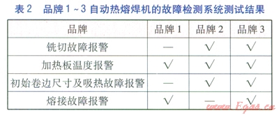 品牌l、2自動(dòng)熱熔焊機(jī)的故障檢測(cè)系統(tǒng)不完整,即使焊接參數(shù)不符合標(biāo)準(zhǔn)也可允許焊接繼續(xù)進(jìn)行。品牌l~3自動(dòng)熱熔焊機(jī)的故障檢測(cè)系統(tǒng)測(cè)試結(jié)果見表2。由表2可知,品牌1、2自動(dòng)熱熔焊機(jī)未對(duì)表2中列舉的所有故障作出報(bào)警提示。